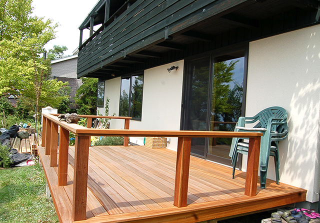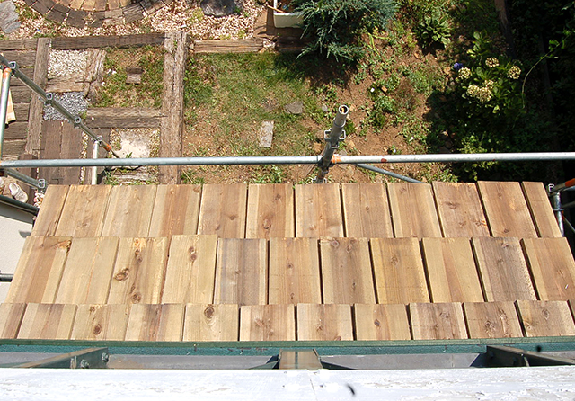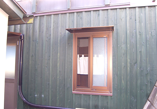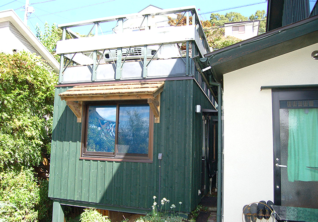 ガレージ下にある離れの客間兼書斎の外壁を母屋のテイストに合わせてグリーンの杉板張に仕上げました。
