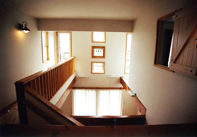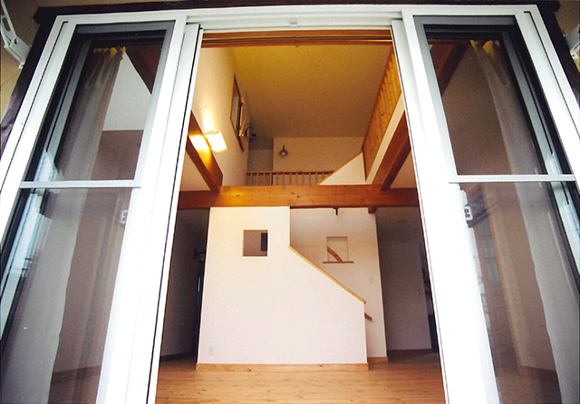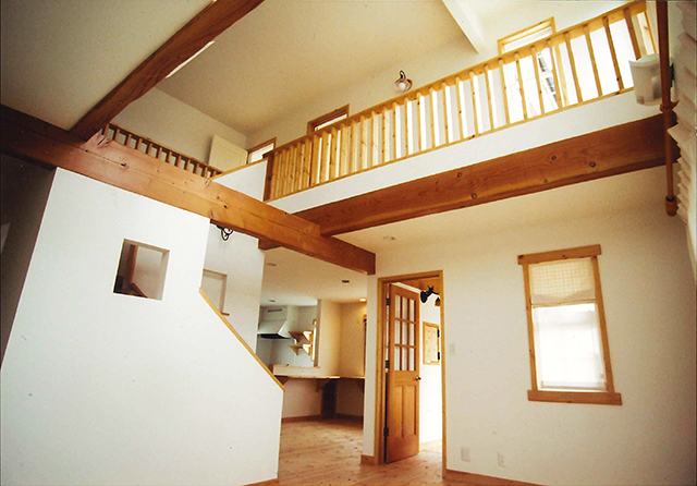 リビングの大きな吹抜に浮かぶ大きな梁や、手作り感いっぱいの廊下の手摺もとても木の温もり感じます。