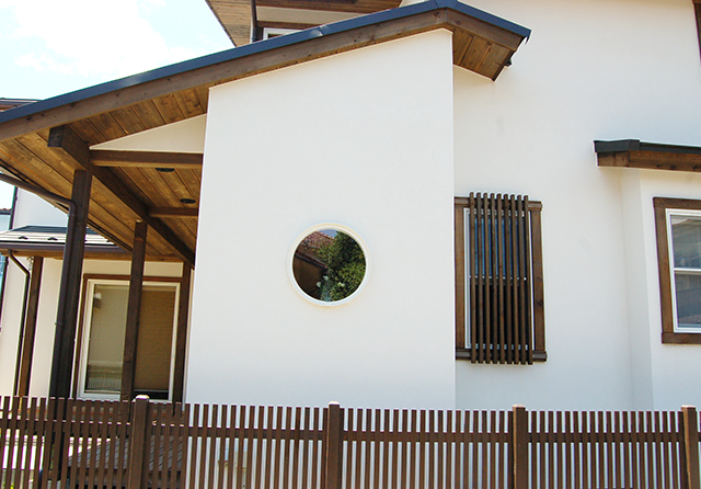 洗い出しの土間のスロープをゆったり上がるアプローチは印象的です.