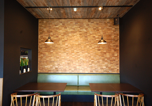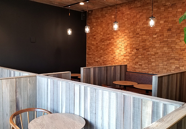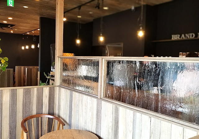 2020年に客席のリノベーションを行いました。杉板で仕上げたパーテーションで 客席をブース分けして、とっても落ち着いてゆっくりお食事やお茶を楽しめる空間になりました。フレンチガラスがとてもアクセントになっています。