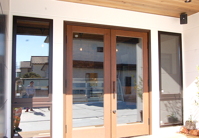 ショップのエントランスは木製ドアとハードウッドのポーチであたたかい雰囲気に仕上げました。