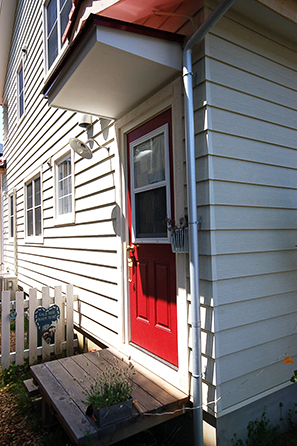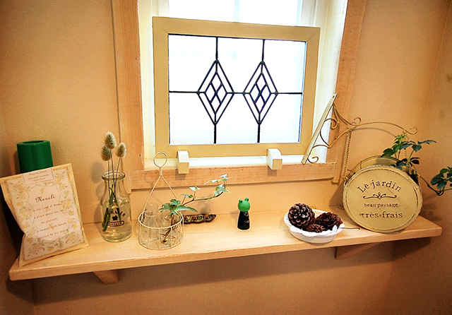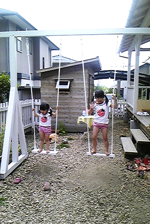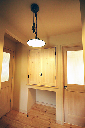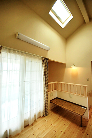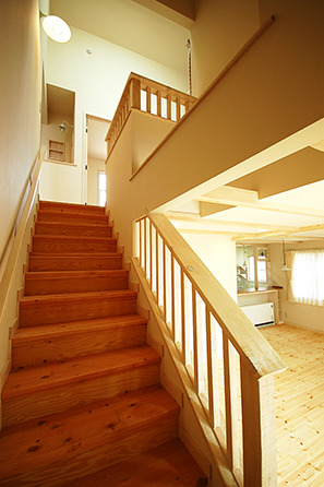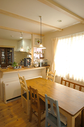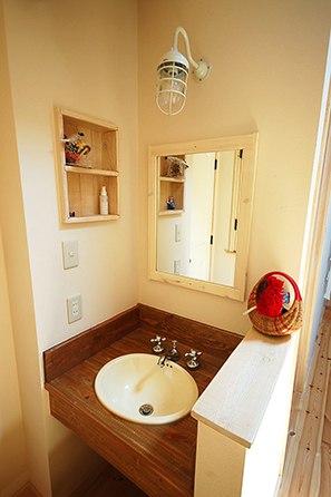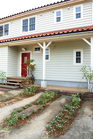 南側のカバードテラス,そして北側のカバードポーチ.スカートのようにお家の両側に2つのギャラリーがあります.素焼きの瓦,真っ白なよろい張りの壁,アンティークホワイトの窓枠.お家は真っ白な木製フェンスに囲まれ,牧草の上に車をとめる様にアプローチは枕木の間を草花が覆いつくす.そんな牧場に建っているようなファームハウススタイルのお家です.室内もアンティークな仕上がりのドアや梁をホワイトで仕上げて,フレンチカントリーテイストの雰囲気です.