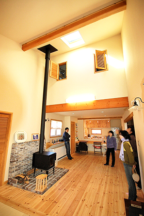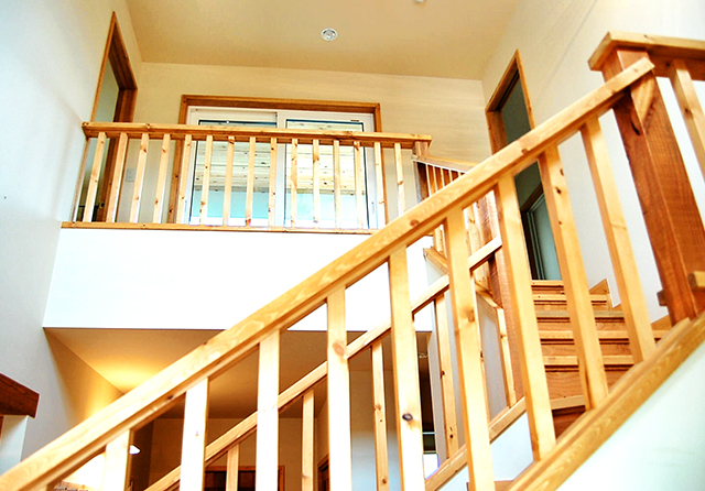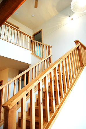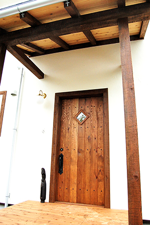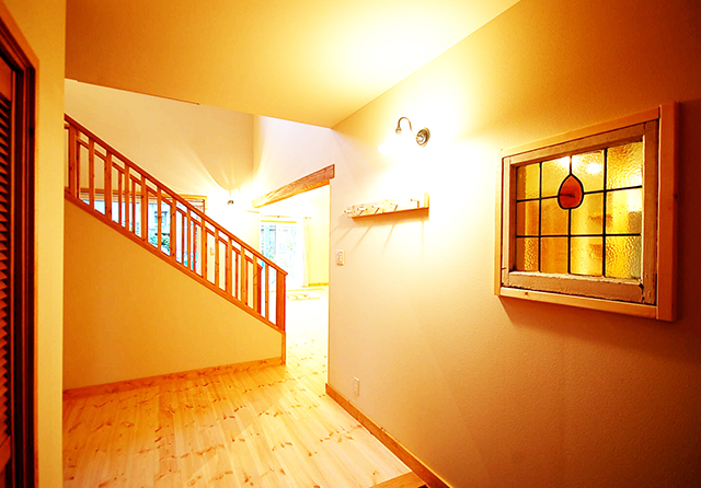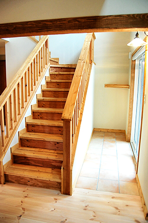 手作りの玄関ドアを開けると壊しい雰囲気の階段越しに土間空間,